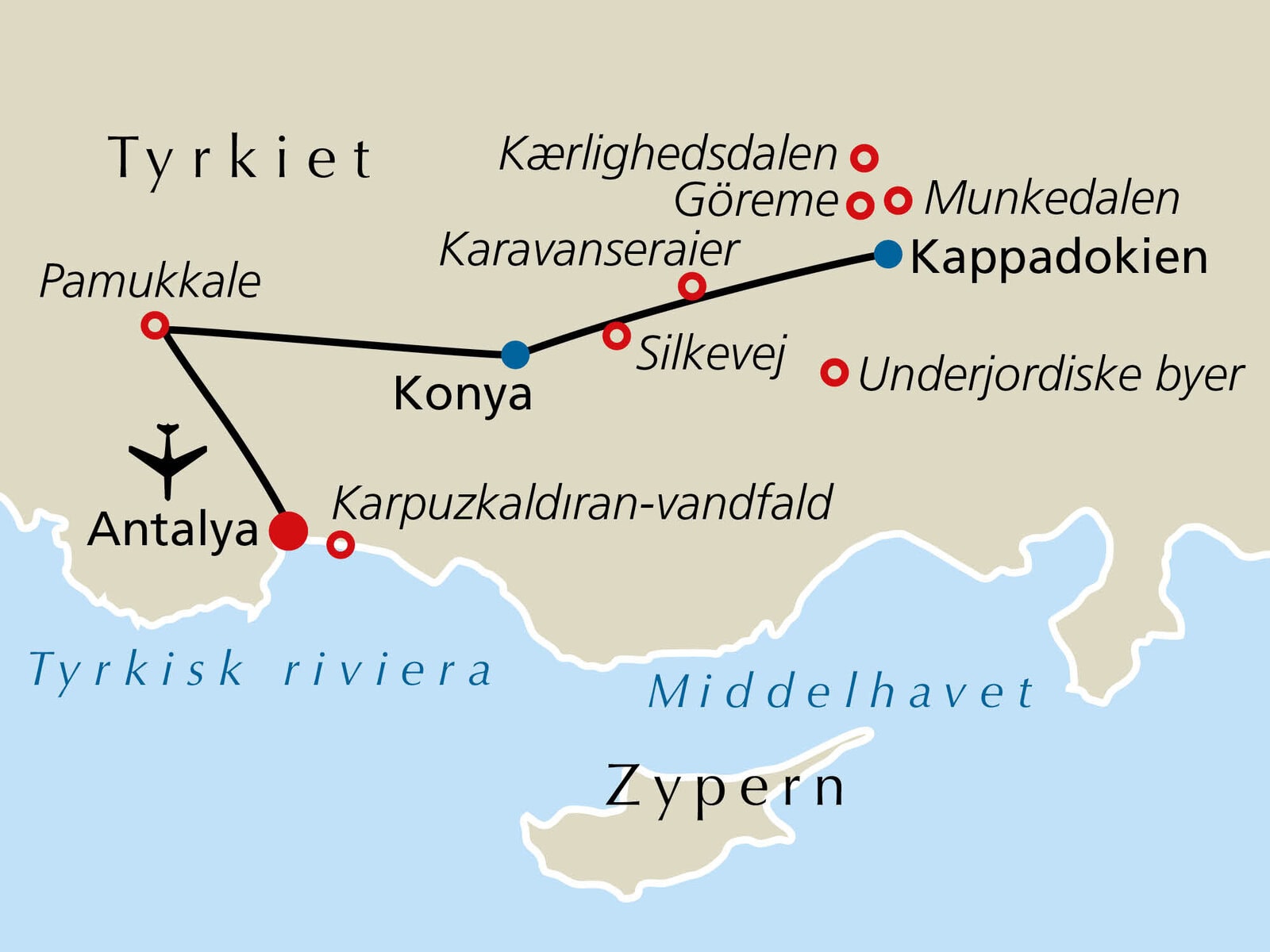 Oplevelsespakke: Pakken indeholder 2× frokost i Kappadokien med internationale specialiteter, en bådtur på floden Manavgat (inkl. frokost), den fascinerende forestilling »Dansende dervisher«, Sultan Han Karawanserei på Silkevejen og det underjordiske museum: kun 129,– € (ca. 990,– DKK*) pr. person (kan bookes på destinationen).